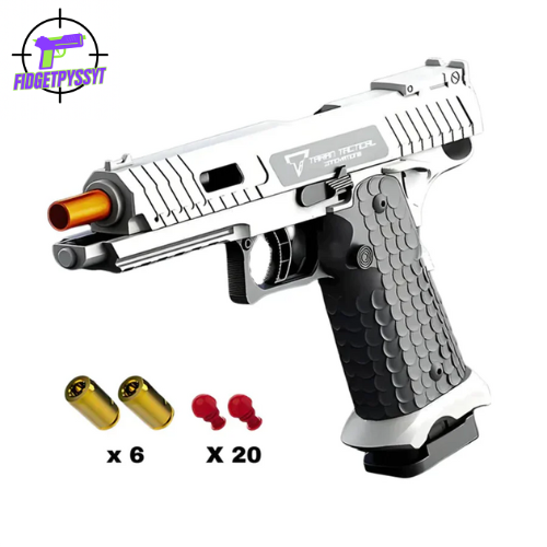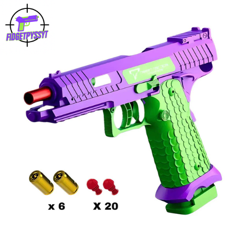 Niittäjä FidgetPyssy on varustettu sekä hylsyjen ulosheitolla että ammuksilla ampumisen mekanismilla. Lataa vain muovikuulat hylsyihin, aseta ne lippaaseen ja ammu menemään!